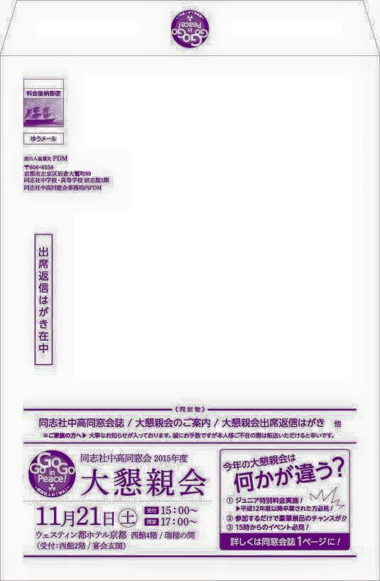 それと、今回の大懇親会も、同じく同封されているハガキで出席の連絡をしてもらうことになってますので、必ず、ハガキを出してください。